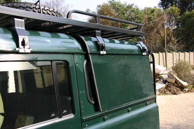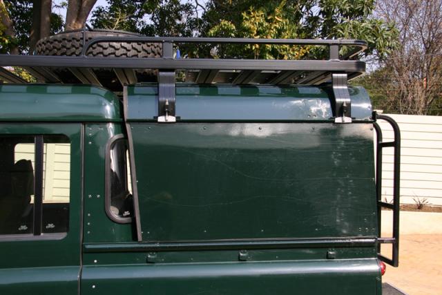 Fitted with additonal 45 liter fender diesel tank (RHS), 45 liter water tank (LHS), Frontrunner full length roofrack + gas bottle & jerry can holders. Rear door top section is made out of a Land Rover Series station wagon door.
